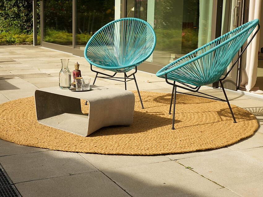 Made of natural and untreated durable coir yarn, Braid is suitable for indoors or outdoor areas. The rough surface lends the carpet an archaic appearance, and the effect on the feet is pleasant, practically like a massage.
