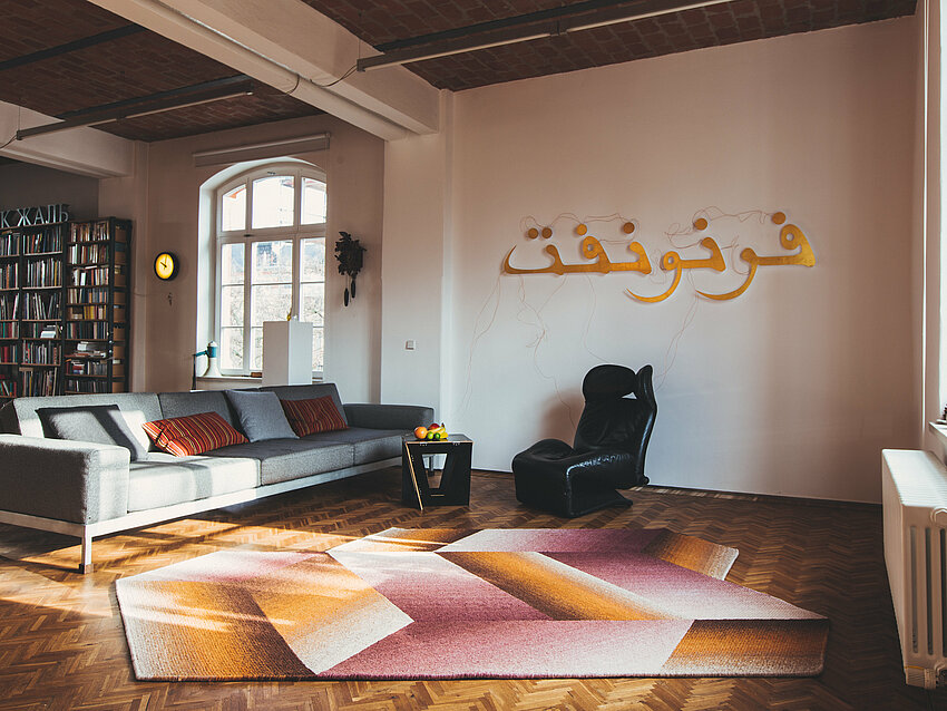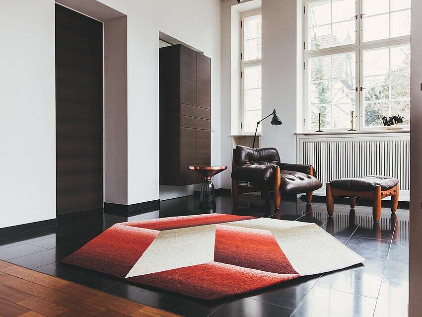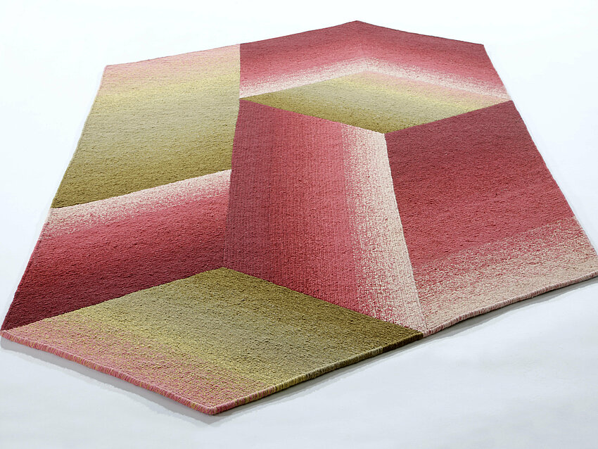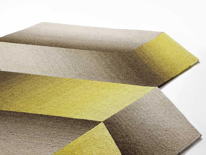 A crystalline play of forms and colours – Patricia Urquiola's LOGENZE shows an irregular geometrical figure consisting of several rhombuses. Inspired by Soumak technique, a traditional weaving technique from the Caucasus, the carpet presents a three-dimensional surface.