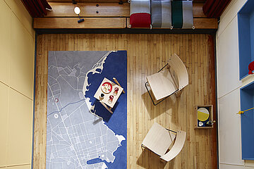 Purchased and restored as a monument by the two enthusiasts Jean-Marc Drut and Patrick Blauwart, Appartement 50 has been regularly functioning as a platform for seminal design exhibitions since 2008. Students on the Product Design MA course at the university ECAL in Lausanne applied themselves with assiduity and enthusiasm to the challenge of developing various objects for the famous Appartement 50 at Le Corbusier’s Cité Radieuse in Marseille. Among the twenty objects of the twelve students that featured in the exhibition, the ATLAS rug by Julie Bernard is outstandingly significant. This is due partly to its size – the rug measures 160 x 240 cm, taking up almost a quarter of the room’s surface area – and on the other hand to its considered approach to color, based on a combination of light grey, dark grey, beige, red and blue. These have not been combined into an abstract pattern, but surprisingly result in a graphically minimized section of the Marseille town plan.