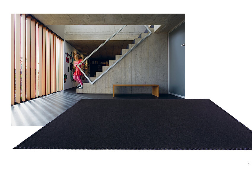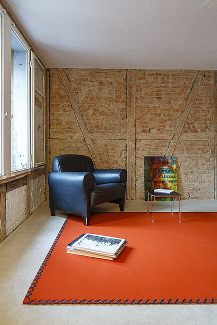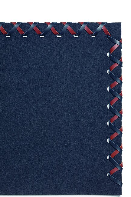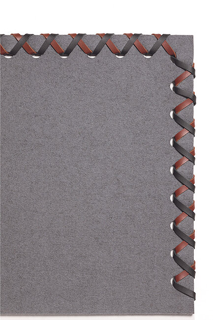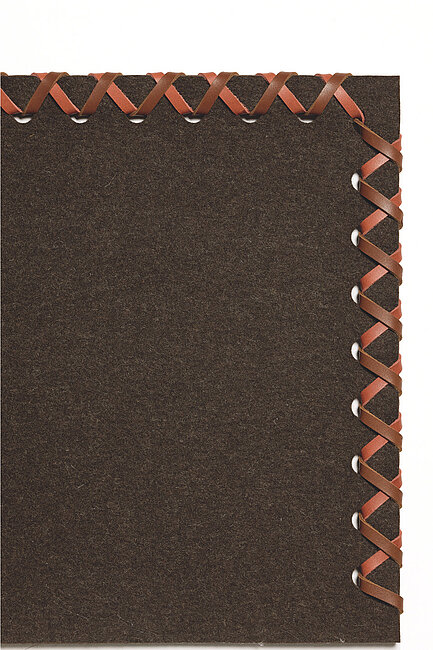 Un entrelacs raffiné forme le cadre de l’ouvrage. Des bandes de cuir entre- lacées avec précision en une ou deux couleurs prê- tent au tapis de feutre une légère note ethniqu