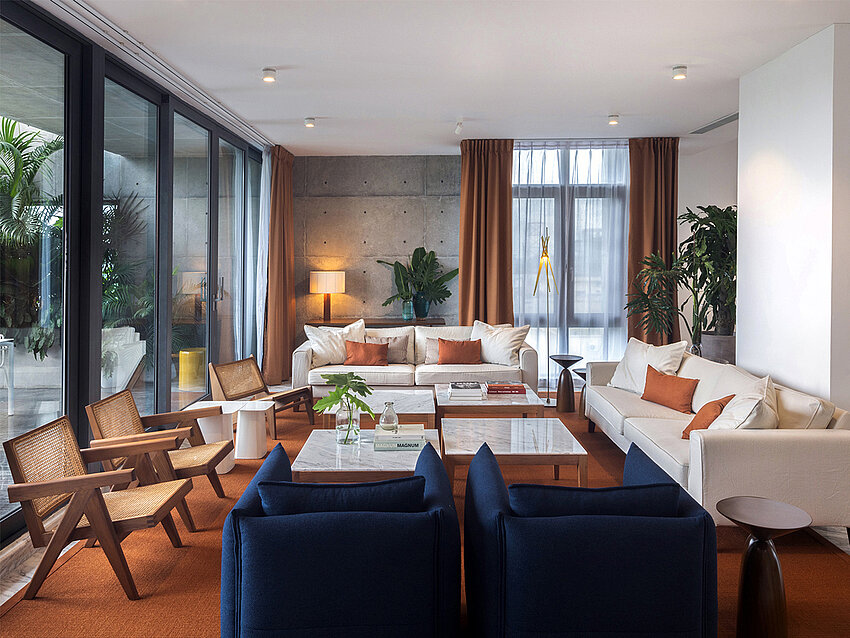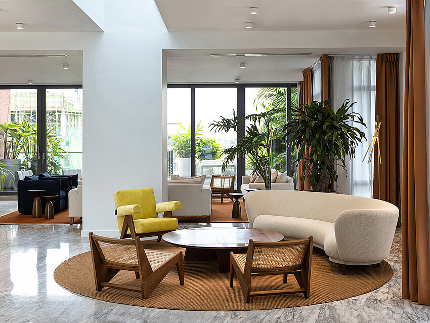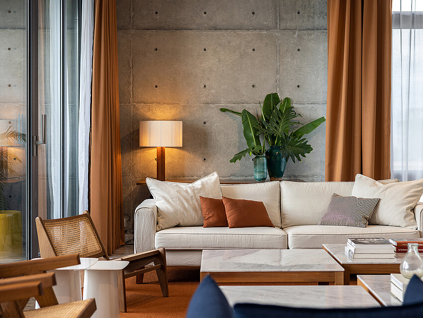 Im dritten Raum, dem Salon der Residenz, werden Besuchende auf dem Sisal-Klassiker Jaipur in der Dimension 4.00 m x 5.70 m im satten Farbton 10224 kupfer empfangen.