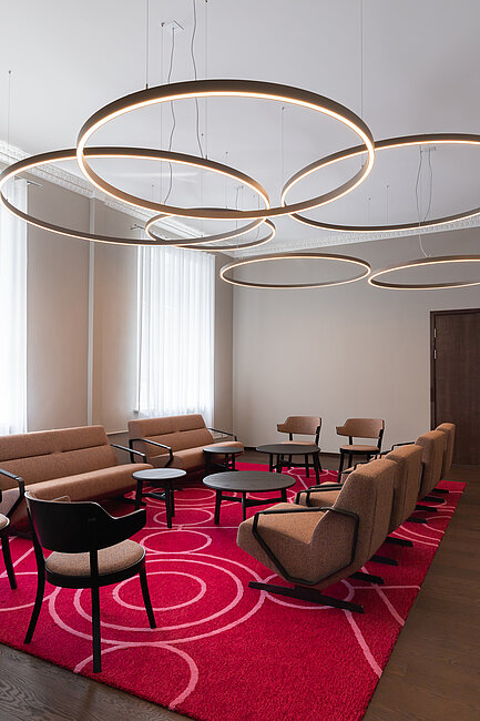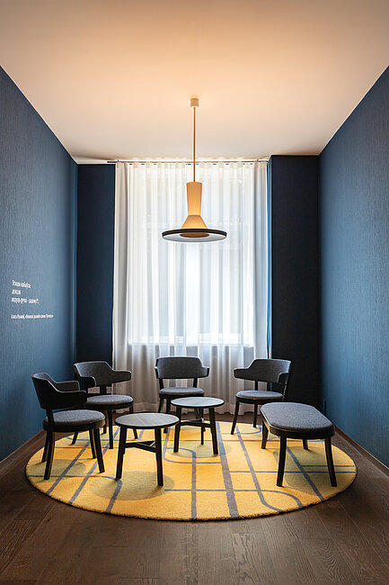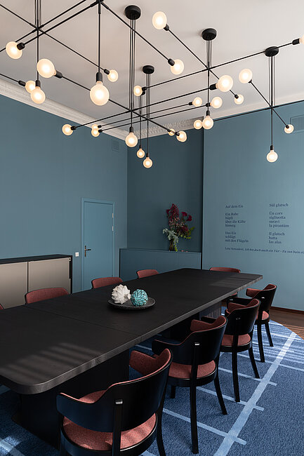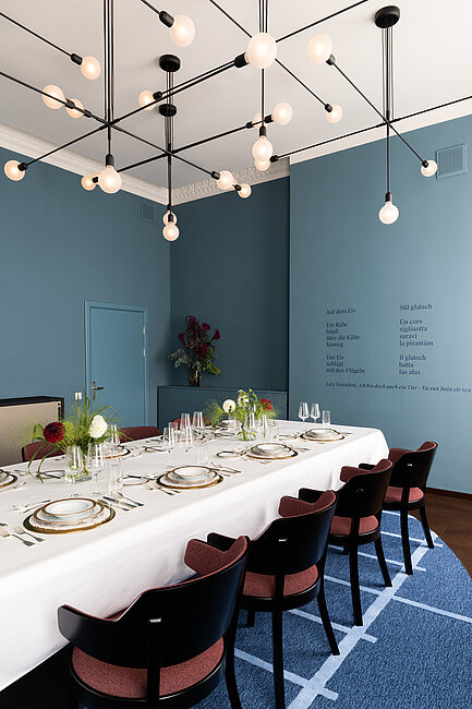 Leitmotiv für Frédéric Dedelley's Einrichtungskonzept waren die belarussischen Farben und Ornamente, die er auf Reisen und Stadtrundgängen aufgenommen hatte. Er hat damit gespielt und zum Beispiel aus Treppengeländern oder Bodenintarsien Muster für die Teppiche kreiert. Frédéric Dedelley hat die starken, fast mediterranen Fassadenfarben an Kirchen oder Sportstadien ins gedämpfte Licht der Innenräume geholt und auch ein bisschen verschweizert. Jeder Raum erhielt eine eigene Leitfarbe und damit seine spezielle Atmosphäre. Im Esszimmer ist es ein Bergblau, das zusammen mit den dezenten Rottönen der Sitzpolster und dem dunklen Tisch für eine heitere Ruhe sorgt. Im Salon dominieren das Rot und Rosa der Textilien, während im Vestibule das Gelb des Teppichs hervorsticht.
