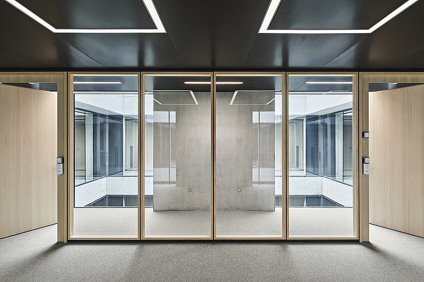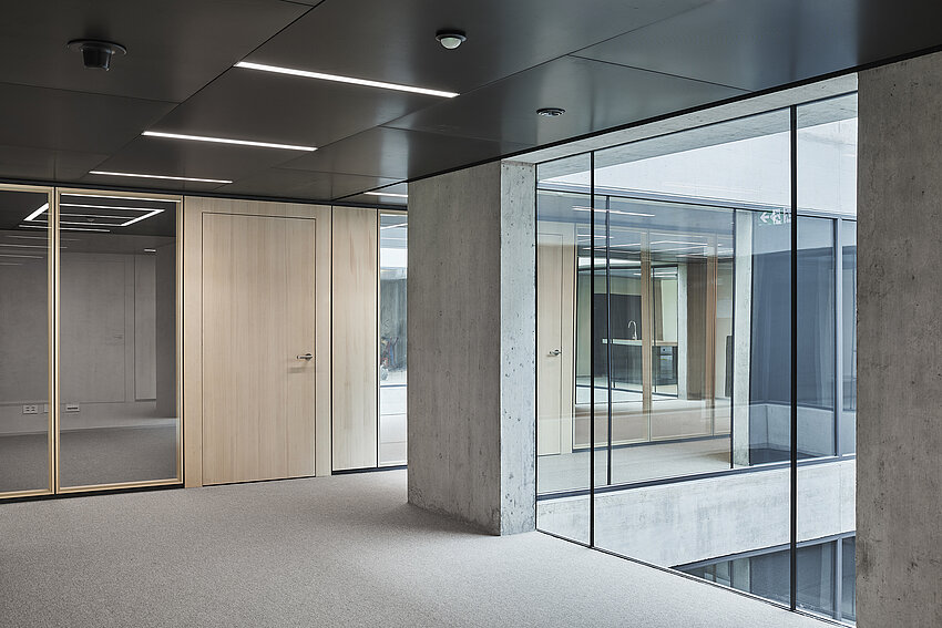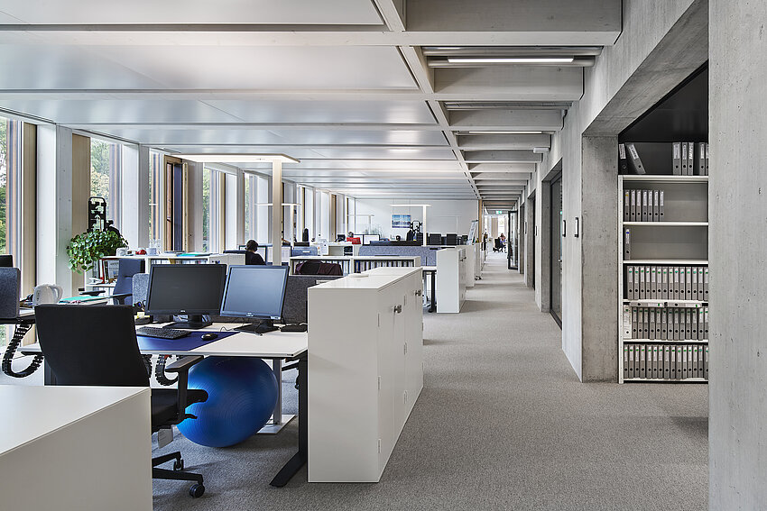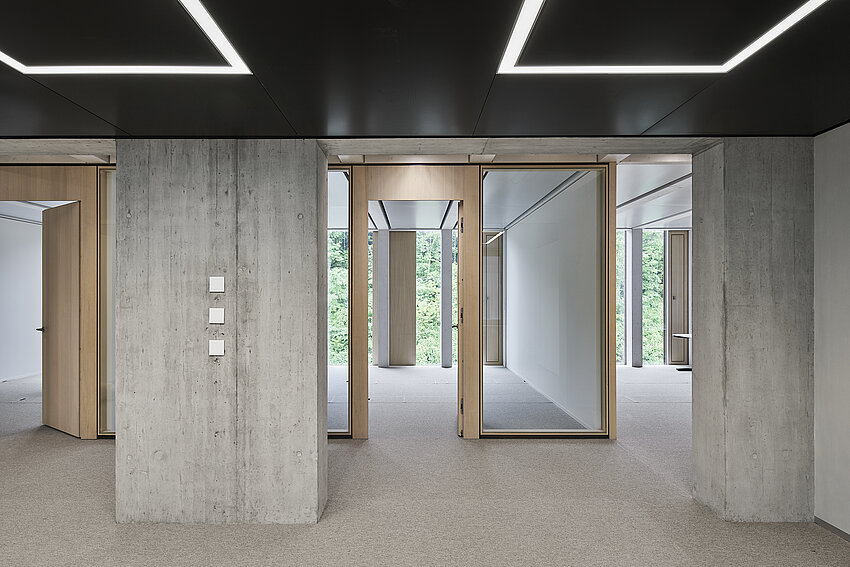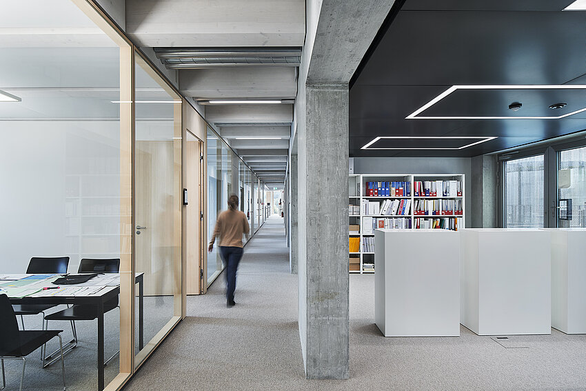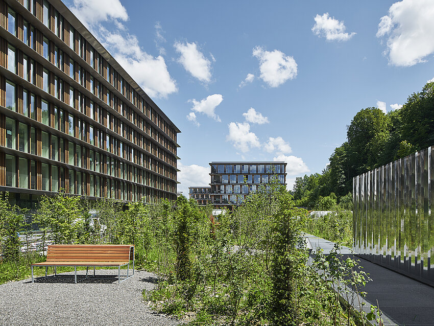 Die Bauten sind in ihrem Ausdruck so gestaltet, dass sie die Sprache der bestehenden Gebäude aufnehmen und interpretieren. Die Gebäudestruktur des Holz-/Betonhybridbaus mit tragenden Holzbalken und Holzstützen ist auf einem regelmässigen Achsraster aufgebaut. Dies generiert in den Neubauten eine polyvalente Nutzungsflexibilität mit individuell unterteilbaren Büroeinheiten. Der Grundsatz der Nachhaltigkeit wird in den Bereichen Gesellschaft, Wirtschaft und Umwelt umgesetzt. Mit einem Primärenergiebedarf, der innerhalb der Vorgaben von MINERGIE-P liegt, kann die Umweltbelastung verringert werden. Der Anteil erneuerbarer Energie liegt in diesem Projekt bei 100%. Das Projekt wurde in einer Pilotphase nach den Anforderungen des „Standard Nachhaltiges Bauen Schweiz“ (SNBS) überprüft und zertifiziert.