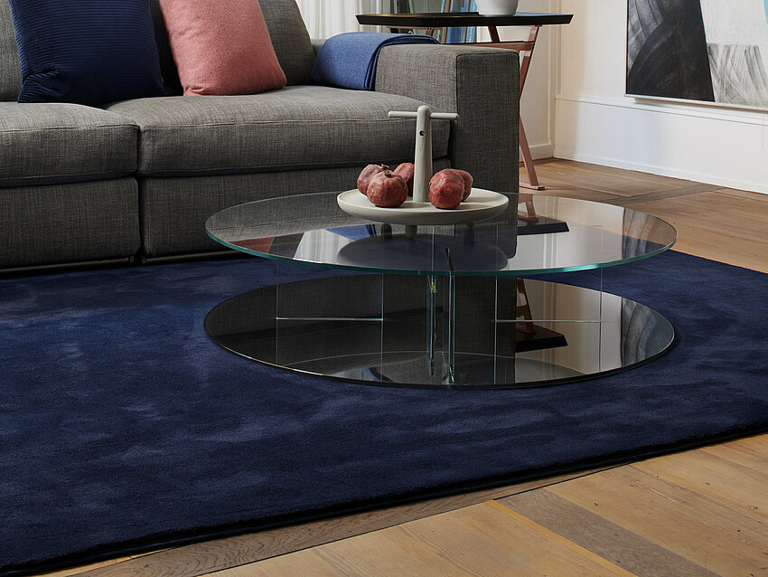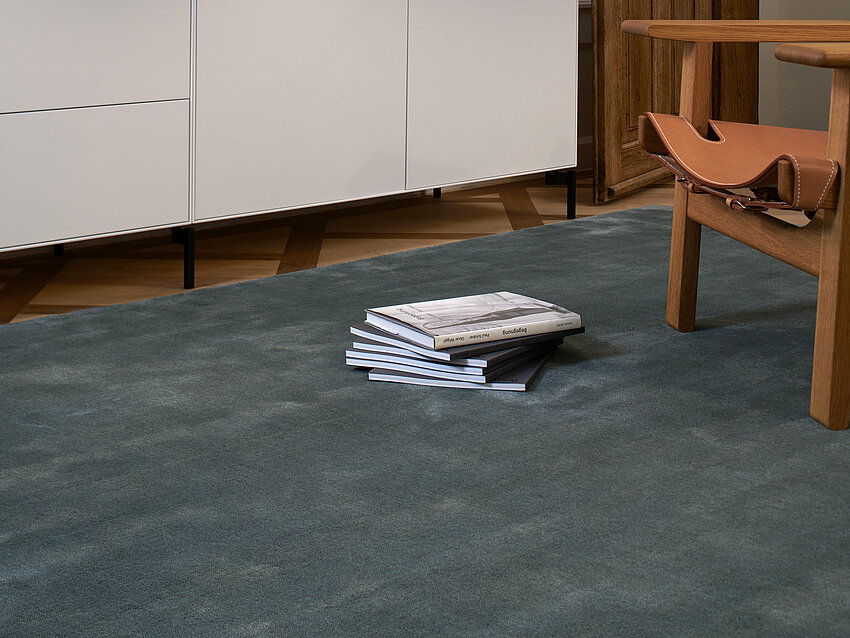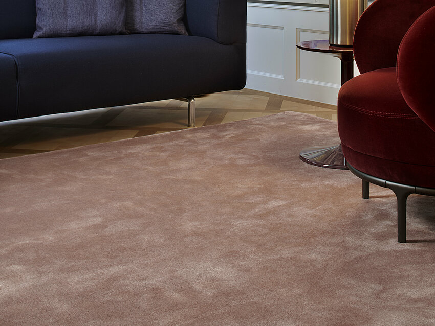 Hampton ist ein hochfloriger Veloursteppich: klassisch in der Anmutung, komfortabel dank hoher Dichte. Die Wolle verleiht ihm Bodenständigkeit, die Viskose einen Hauch von Glamour.