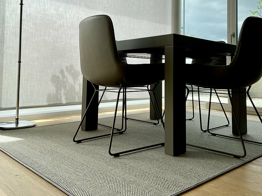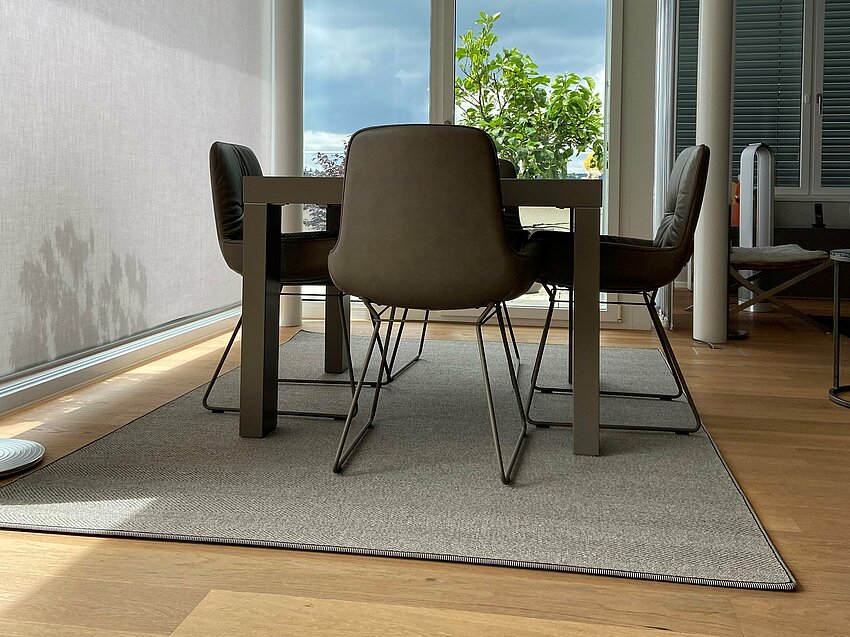 Herringbone – zu Deutsch Fischgrätenmuster – wird dieses seit Jahrhunderten gefertigte Muster genannt. Der gewebte Schurwollteppich gibt dem Raum Struktur und Richtung. Kundenfarbe ab 200m2 möglich.