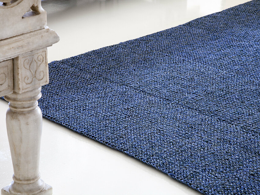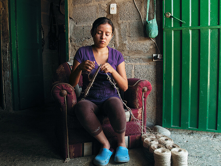 Kolumbiens Nationalfaser Fique wird in Zusammenarbeit mit einer Strickmanufaktur zu handmade Teppichen gefertigt. Das Naturmaterial wird in den kolumbianischen Anden von Hand gesponnen und dann auf grossen Stricknadeln zu einmalig schönen Teppichen verstrickt.